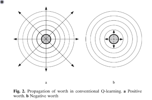 - 學習完的Q table只有靠近牆壁的Q值會變成負的,之後就不會再傳遞擴散了,這就是作者所說的負reward缺點,因此作者給出一個構想圖解釋