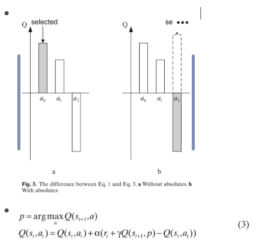 - 作者提出使用絕對值來更新Q value,如此一來負的reward就可以一直傳遞下去,圖三為作者的解釋,當要更新Q值的時候,原本的Q learning 演算法會下一個狀態最大的action value 做更新,但是遇到負的reward時,Q learning 通常都不會更新只會更新撞到牆壁的那一次,因此負的reward都不會傳遞開來,作者提出當要更新Q值的時候應該選擇argmax 絕對值大的來更新,如圖三所示,原本的Q learning 會選擇$a_1$,但作者提出應該使用$a_3$ 來做更新的動作(指公式三的p)