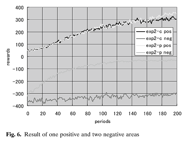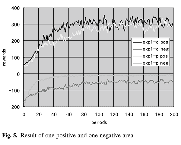 - “exp1-p” 代表本文提出的方法,c 代表原本方法,pos代表正的reward 加總,neg代表負的reward 加總,由圖可以得知在正的reward兩種方法不相上下,但是在負的reward中作者提出的方法明顯比原來的方法好